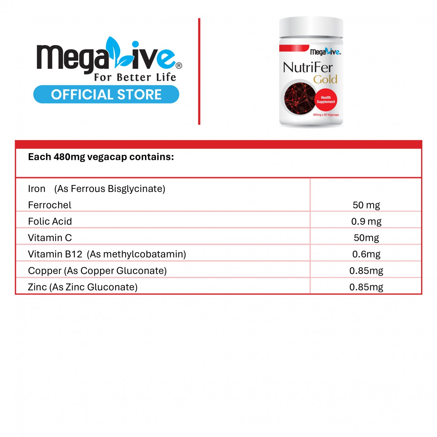 MegaLive Nutrifer Gold contains Iron (Ferrous Bisglycinate), Folic Acid, Vitamin C, Vitamin B12, Copper Gluconate and Zinc Gluconate. This combination product helps to replenish iron stores and increases production of red blood cell in the body.