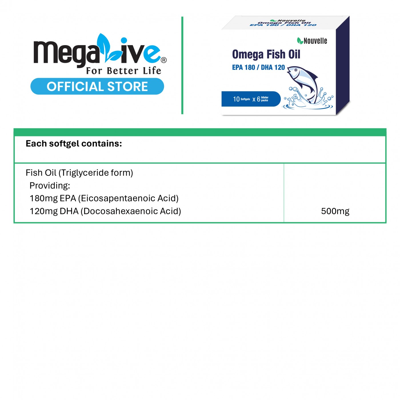 - 180 mg EPA (Eicosapentaenoic Acid)