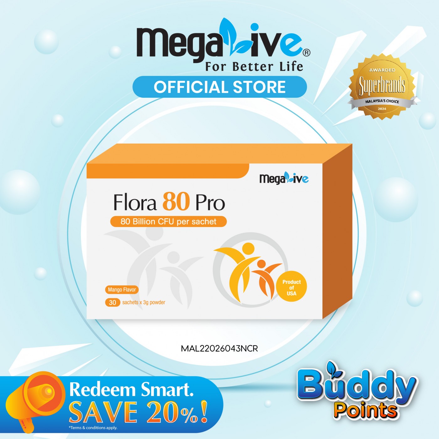 MegaLive Flora 80 Pro is a mango flavoured powder composed of 6 strains of probiotics (providing 80 Billion CFU per sachet) and prebiotic; fructooligosaccharides (FOS) for your overall digestive health.
