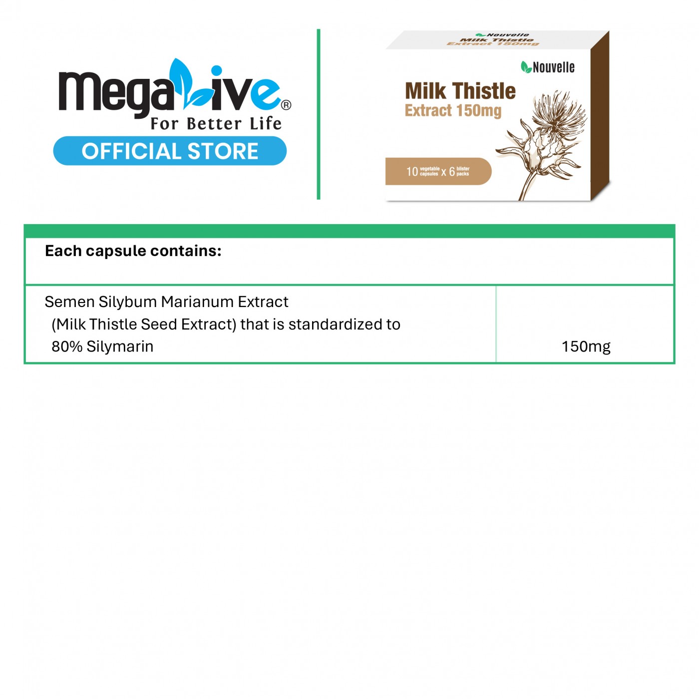 Semen Silybum Marianum Extract (Milk Thistle Seed Extract) that is standardized to 80% Silymarin – 150 mg